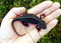 | 丁度しろちゃん達の車が上ってきたので、イボイモリを見せて採集場所の様子を説明します。みんな納得した様子で蜘蛛の子を散らすように各々調査を再開します。 結局、同じ様な環境で4匹のイボイモリを見つけることができました。 奄美大島産のイボイモリは、形態的には徳之島の個体群とよく似ていますが、大きさは、沖縄島や瀬底島の個体群よりは小さいのですが、徳之島の個体群よりは大きく、ちょうど沖縄島・瀬底島と徳之島の中間的な大きさです。 生息密度はいままで調査した島の中では一番低い印象を持ちましたが、それは奄美大島産イボイモリの生息環境を把握しきれていないためかもしれません。 時計を見ると2時を回っています。一度山を降りて住用村に向かうことにしました。住用村では遅い昼食を済ませ、住用村側から三太郎峠をへて中央林道に至るルートの下見に出かけます。ここは、去年アマミノクロウサギを始め奄美固有の生きものを多く観察したポイントで、しろちゃんやもりちゃんにもクロウサギを見せてあげたいからです。車をゆっくり走らせながらウサギの糞を捜します。激しい雨がふっているため、糞を捜すのも一苦労です。それでもいくつかの場所で可愛らしい糞を見付けることが出来ました。 |