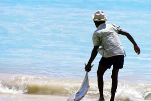 海岸は、緩やかな円弧を描く美しい砂浜と花崗岩の奇岩が景観領域を形成した、理想的な海岸です。砂浜の背後の濃い樹林も見事としか言いようがありません。 早朝の為、リゾート客の姿はありませんが漁師が地引き網を引いています。トランペットフィッシュなどの様々なさかなが次々にあがってきます。小さな木造船では、釣り上げたキハダマグロを荷揚げしています。のんびりとした海辺の風景を写真に収めていると眩しげな太陽があがっていました。 |