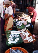 みんな朝早くから海に腰まで浸かったり、海岸でしゃがみ込んでいます。最初は何をしているのか解らなかったのですが、どうも朝一番の用足しの様です。どおりで海岸に沢山ウンチが転がっているはずです。ウンチを踏まないように歩きながら海岸伝いに市場に向かいました。 市場は何処でもそうなのですが、元気のいいおばちゃん達で賑わっています。ちょっと若い人は、日焼け止めの黄色い粉を顔全体に塗っています。 |