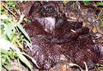 アルノルディイの蕾に間違いありません。 ラフレシア アルノルディイ(Rafflesia arnoldi)は、1817年にイギリスのラッフルズ卿夫妻とアーノルド博士がスマトラを探検旅行をしているときに発見し、その時に作成された詳しい記録と詳細な写生図をもとに専門家によって新種記載された種です。学名は第一発見者である2人の名前に因んで命名されました。ちなみに現地名はスケディ(おばけ)といいます。 花の大きさは直径1.0m以上、その重さは20kg近くになります。蕾は小さなコブの状態から巨大ピンクキャベツになるまでに9カ月以上、開花が始まって完全に開花するまでに2日以上もかかります。しかし、開花後は徐々に腐敗し、花期は3日程度しかありません。 さて、ザックからカメラを取り出して写真撮影です。レンズが曇ってなかなか上手く撮影できません。ふと気付くと足下に腐った花も見つけ、これも撮影します。 |