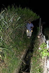 | 山に登って多くのハブさんにご挨拶をするか、集落近くでカエルやシリケンイモリを観察するか迷ったのですが、同好の友人であるHさんからタシロヤモリの採集を頼まれていたし、我慢しきれずにビールも飲んでしまったので、集落周辺を散策することにします。 玄関で長靴を履いていると、おばあが塩を掛けてくれました。昔から夜、山に入るときは、塩で体を清めるのだそうです。 おばあのあたたかい気持ちに感謝して、まずは、水田に向かいます。集落内の道でアカテガニの仲間を撮影しながら進むと、人気のない道路に袋を持ったおじさんが現れました。何事かとたずねるとハブが出たとのこと。 これはラッキー。捕獲風景を撮影させてもらうこととします。 |