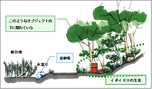 | 地図上で生息環境にあたりを付けて、現地に入ります。 生息環境の項で示した環境を見付けると、次はイボイモリが隠れていそうなオブジェクトを探します。 水場近くのオブジェクトでも、氾濫源に位置する場合には隠れていません。 オブジェクトが増水時に水没する位置にあるかは、落ち葉の堆積状況や下層植生の有無で見分けます。 腐葉土や落ち葉の堆積が少なく、下層植生の発達が悪い、オブジェクトの下がどろどろの状態の場合は増水時に水没する場所です。 観察は、オブジェクトをひたすらひっくり返し、オブジェクトの下に隠れているイボイモリを探します。 トタンの様な大きなオブジェクトや石がガレ場のように積み重なった場所には、ヒメハブなども隠れていることがあるため、不用意に素手をオブジェクトの隙間に突っ込んだりしないようにします。 オブジェクトをひっくり返すときは、軍手をして手鍬を使うと安全性が高まります。 前記したように、天然記念物に指定されているため、触ることは禁止されています。イボイモリはオブジェクトをひっくり返しても、ほとんどの個体はじっとしています。写真撮影などを行ったら、もとの位置に戻してください。 |